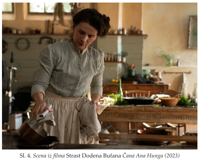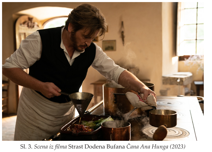 Četvrti film na listi, ili ključna studija slučaja ovog rada jeste film Strast Dodena Bufana (La Passion de Dodin Bouffant / The Taste of Things) iz 2023. godine, francuskog autora vijetnamskog porijekla Čana Ana Hunga, u kojem glavne uloge igraju Benoa Mažimel i Žilijet Binoš. Scene kulinarske raskoši i užitka od početka do kraja određuju dramaturgiju filma i ljubavnu priču. Odnosi para, kao i njihovi susreti s bliskim prijateljima neodvojivi su od rituala pripremanja hrane, njenog posluženja i konzumiranja. Priprema hrane i njeno posluživanje u cjelosti određuju rediteljski postupak, ne postoji nijedna scena niti jedan odnos u ovoj ljubavnoj priči bez hrane. Put iz pećnice ili od šporeta do stola, ili do sobe, jeste put emocija ili je hrana medijum odnosa dva glavna junaka filma: Dodena koji u raskošnom domu francuske buržoazije XIX vijeka živi sa svojom kuvaricom Eugenijom. Svako jelo koje dijele, bilo sami ili sa Dodenovim prijateljima, scenaristički je i rediteljski rukopis koji predstavlja odu slavljenju života i ljubavi, i, naravno, francuskoj kuhinji. Scena pripreme jednog od možda najzahtjevnijih jela francuske kuhinje pot-au-feu nakon gledanja ovog filma može postati pravi izazov, a izazov nabavke junećeg buta, teleće koljenice, goveđeg repa, goveđe plećke, dva goluba i kostiju sa srži uz sve ostalo vrijedan je čin ljubavi. Film ulazi u širi narativ o francuskoj kuhinji koji se čita kompleksno kada se uzme u obzir mogući izbor književnih i publicističkih djela francuske kulture koja na taj način daju omaž svojoj nacionalnoj kuhinji. Izdvojimo dva djela: Rječnik zaljubljenika u kulinarstvo Alena Dikasa i roman Godišnji banket bratovštine grobara savremenog francuskog pisca Matijasa Enarda.