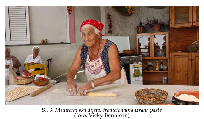 Ako se izuzmu opšta mesta o hrani i obedovanju, nema ni slova o gastronomskom nasleđu, iako ni najmanje sumnje nema da je upravo posredstvom upisa ova dva elementa ono na velika vrata ušlo u elitni sistem vrednosti od značaja za čovečanstvo. Ono što je dodatno interesantno jeste činjenica da UNESCO u međuvremenu nije napravio napor da se pozabavi makar preliminarnim definisanjem ovog oblika kulturnog nasleđa. Tako će se dogoditi da i transnacionalni element mediteranska dijeta3 (Sl. 3), u čijem upisu su zajednički učestvovali Grčka, Italija, Maroko, Španija, Kipar, Hrvatska i Portugal 2013. godine, primarno stavi akcenat na usmene tradicije, običaje i svetkovine, ali i da naglasi znanja i veštine vezane za proizvodnju, pripremu i konzumaciju hrane (UNESCO ICH: 2013). Na taj način su, iako i dalje bez preciznije definicije i jasnijih kriterijuma, širom otvorena vrata gastronomskom nasleđu pod okriljem UNESCO-a.
