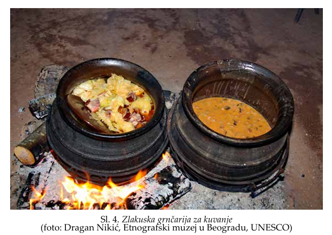 Među ovim elementima našla su se svega tri iz našeg regiona, odnosno republika bivše Jugoslavije, danas samostalnih država. I to jedan iz Hrvatske, pomenuta transnaciona na mediteranska dijeta, kao i dva iz Srbije: zlakuska lončarija (UNESCO ICH: 2020) (Sl. 4) i društvena praksa i znanja vezana za pripremu i konzumaciju tradicionalne šljivovice (UNESCO ICH: 2022) (Sl. 5). Jasno je da oba elementa iz Srbije imaju posrednu vezu s gastronomskim nasleđem, jer je reč o starom zanatu u čijem fokusu je izrada grnčarije koja se koristi za pripremu i serviranje hrane, odnosno alkoholnom piću koje se tokom obroka najčešće servira kao aperitiv. Te činjenice, međutim, ne umanjuju njihov značaj u ukupnoj slici gastronomskog nasleđa, jer su važni činioci procesa svojstvenog nematerijalnoj kulturnoj baštini, a da podsetimo – Konvencija ima za cilj upravo očuvanje kulturnih procesa.